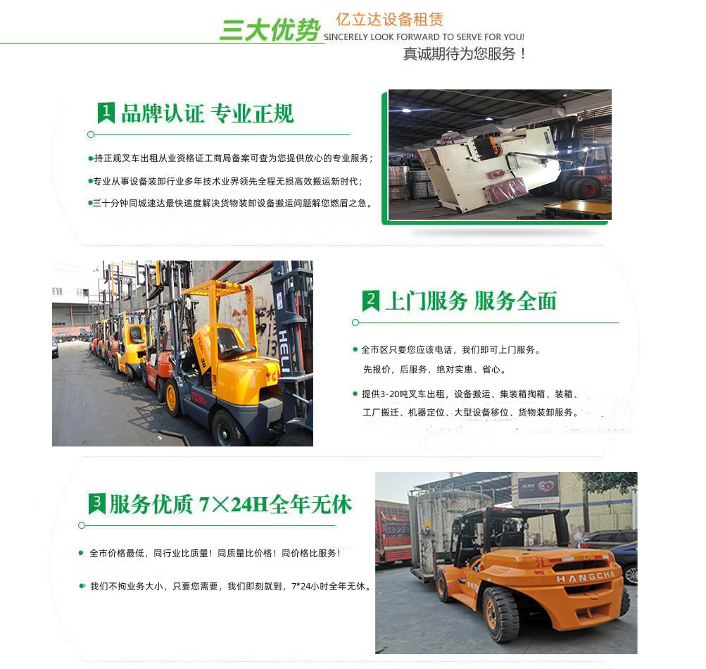 亿立达设备租赁有限公司是工商局准许的武汉沌口专业叉车出租公司,公司本着诚信、服务、效率、创新的经营理念,用精湛的技术,真诚的服务,为众多客户提供优质的服务,同时获得信赖与支持。专业提供武汉沌口3-20吨叉车出租、叉车租赁、设备搬运、集装箱掏箱装箱、机器移位定位、货物装卸、工厂搬迁、安全可靠,收费透明,价格便宜,随叫随到,24小时上门服务!本公司叉车吊车师傅对各种设备搬运装卸都有深刻探讨和研究。很多的疑难设备搬运,通过我公司的叉车师傅都能迎刃而解。对各种进口设备、国产机器、大型设备搬迁、高难度搬迁、各种精密仪器、医疗设备、科研设备等都能搬运; 提供全市 24 小时上门装卸搬运服务。同时提供厂房搬迁服务。 ...